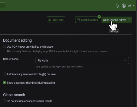 It needs an API token. Go over to the Paperless web interface, open Settings, and in the top right corner you'll see Open Django Admin.