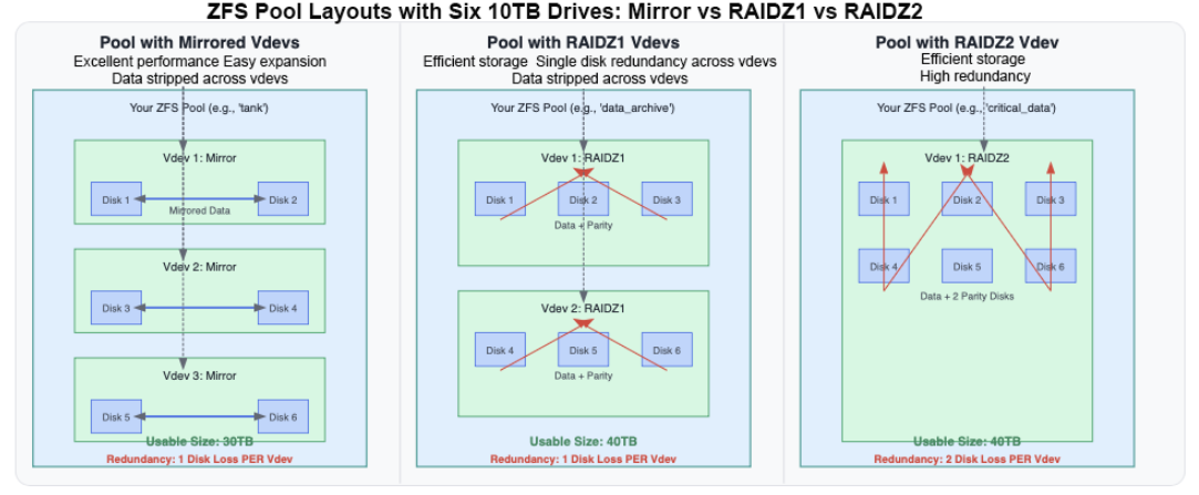 La redondance est toujours par vdev. Si un vdev échoue, l'ensemble du pool échoue, même si d'autres vdevs sont sains. Planifiez vos vdevs avec soin!